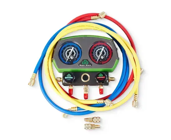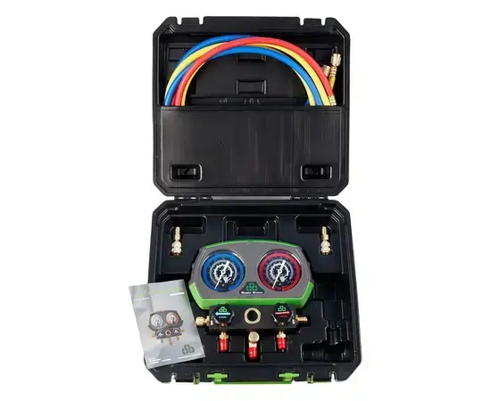 Двухвентильная манометрическая станция с шаровыми вентилями и смотровым стекломSuper Stars ST-B280с диаметром манометров 80 мм для работы с фреоном R22 / 404 / 407 / 410.Предназначена для обслуживания и ремонта кондиционеров, бытовых и торговых холодильных / морозильных камер.Комплектация:Манометрический коллектор;Три заправочных шланга с гайками SAE 1/4" длиной по 1,5 метра, на рабочее давление 800 PSI (до 55 Bar);Два переходника 1/4" х 5/16" SAE (R22 / R410/R32);Пластиковый кейс.