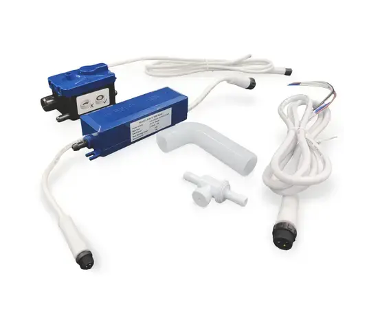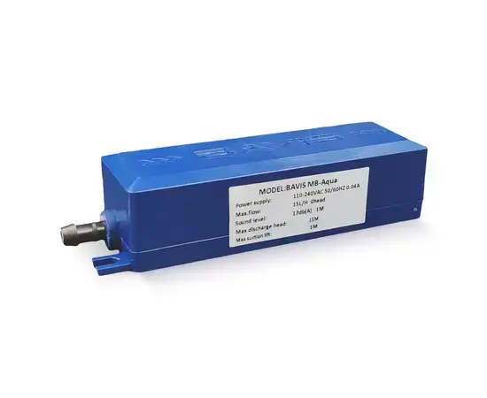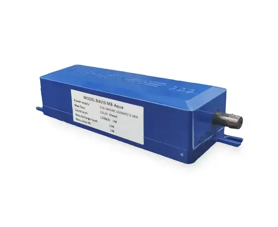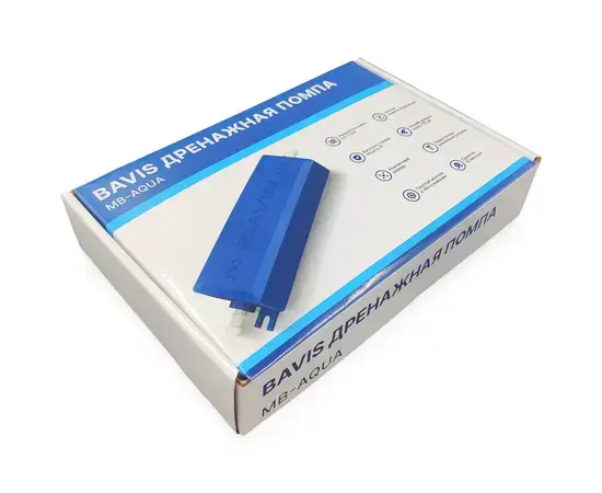 BAVIS MB-AQUA— помпа проточного типа производительностью 15 л/ч для отвода конденсата от бытовых и полупромышленных систем кондиционирования. Устанавливается в корпусе внутреннего блока, над потолком, в кабель-канале или в дренажной магистрали. Помпа состоит из насосного блока (качающий узел) и резервуара с поплавковым датчиком уровня воды.Качающий узел насоса MB-AQUA изготовленпо технологии ротационной мембраны. Благодаря этой технологии, дренажный насос имеет сверхнизкий уровень шума 17Дб, а также исключается вибрация в процессе работы.Особенности:Компактный корпус из ABS-пластика совместим с большинством из существующих сплит-систем;Электронная система управления выполнена по схеме раздельных контуров и имеет несколько степеней защиты от скачков напряжения в электросети;Все узлы и элементы конструкции выполнены с учетом эксплуатации в условиях повышенной механической нагрузки;Специально разработанная резиновая смесь для условий интенсивных нагрузок и низких температур;Гальваническое антикоррозионное покрытие гарантирует защиту деталей в условиях повышенной влажности;Качающий узел насоса изготовлен по технологии ротационной мембраны, благодаря чему дренажный насос имеет сверхнизкий уровень шума.