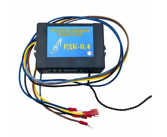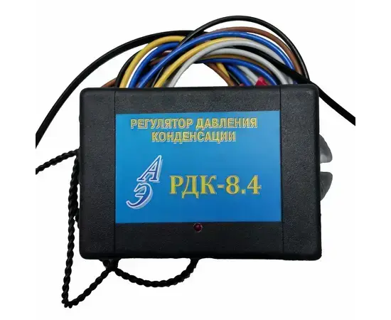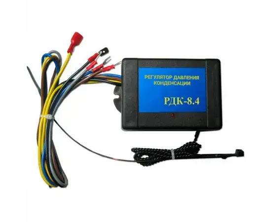 Регулятор давления конденсации РДК-8.4 предназначен для обеспечения работоспособности систем кондиционирования, работающих в режиме охлаждение или охлаждение-нагрев мощностью по холоду до 14 кВт, при температуре наружного воздуха до -40°С. Не требует регулировки, может применяться с различными типами кондиционеров.Устройство РДК 8.4 официально заявлено и рекомендовано Европейским представительством MITSUBISHI ELECTRIC в Москве.Микропроцессорное устройство контроля давления конденсации РДК-8.4, позволяет поддерживать стабильную температуру и давление конденсации, посредством изменения скорости вращения вентилятора наружного блока кондиционера (вплоть до полной его остановки), в зависимости от температуры теплообменника.Регулятор поддерживает давление конденсации на номинальном уровне независимо от изменения температуры окружающей среды посредством изменения объёмного расхода воздуха через конденсатор внешнего блока в зависимости от температуры конденсации. В качестве регулирующего элемента используется полупроводниковый термодатчик, закреплённый на «калаче» конденсатора внешнего блока.РДК-8.4 имеет индикацию режимов работы, а также индикацию результата самодиагностики исправности термодатчика.
